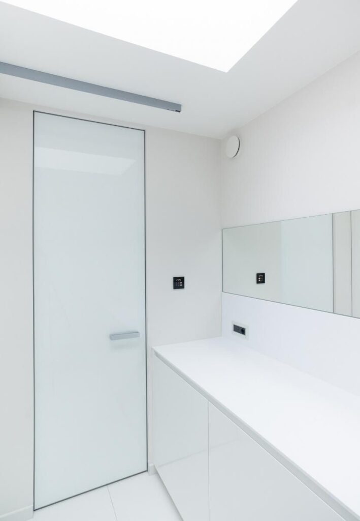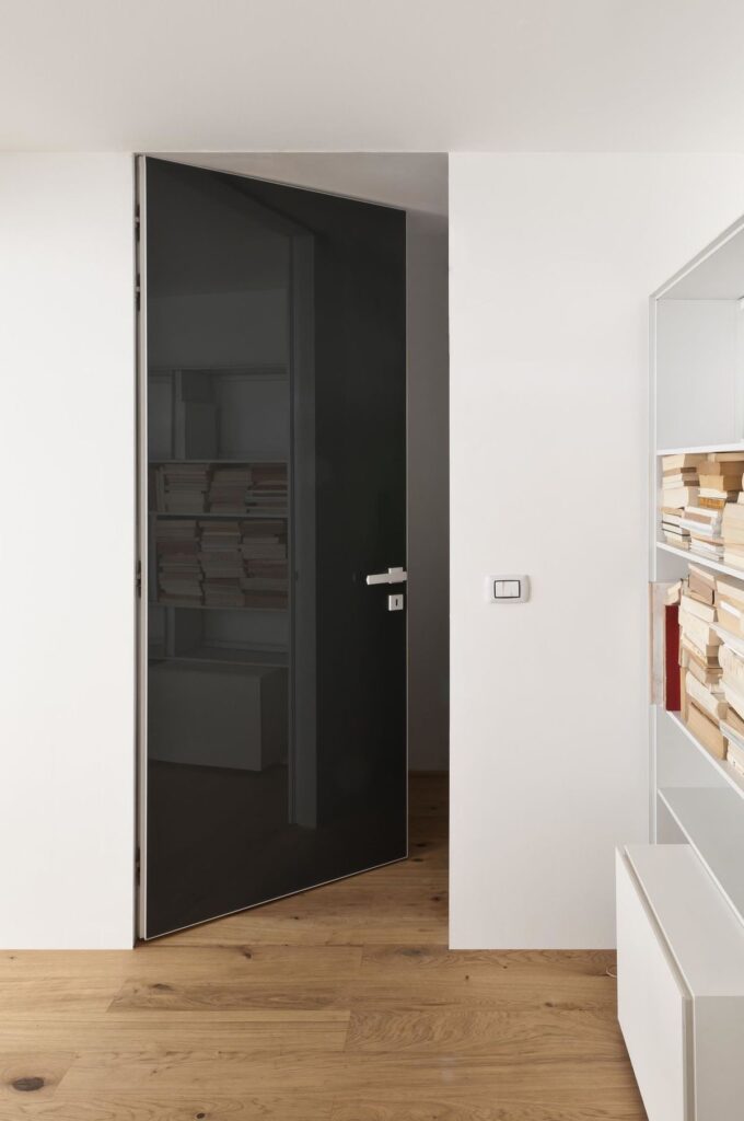 Glass виготовляється з загартованого непрозорого скла, пофарбованого на виробництві за каталогами RAL або NCS. Двері виглядають монолітно та сучасно.